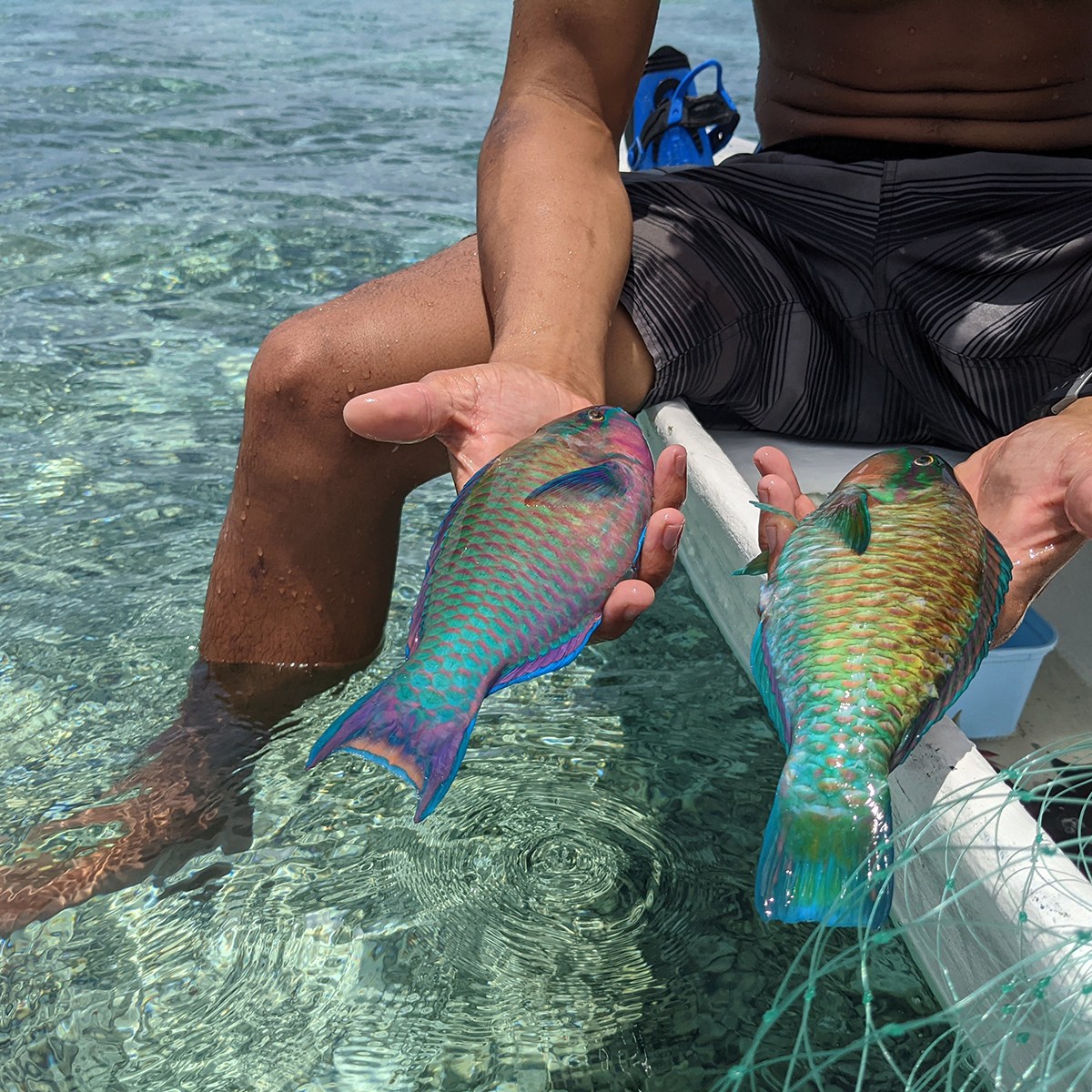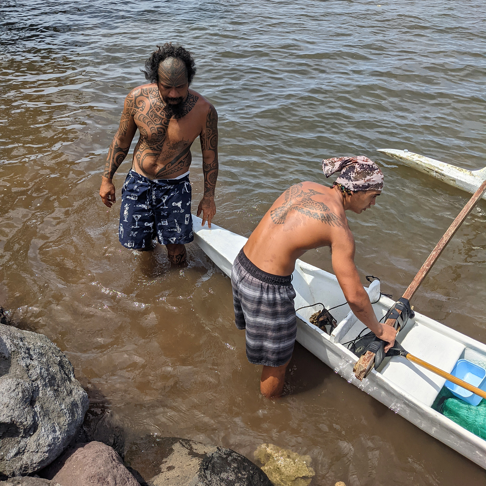 Within a hundred or so meters of the breakers marking the reef, the cadence of Manu’s strokes slows somewhat, from which I infer that we’re approaching our spot. “OK, this is it,” he confirms as he works the roped weight that will anchor our small vessel. We put on our snorkel gear and jump in at a depth just over my head, Manu with a fifty-meter net in his left arm. For the next ten minutes, I watch from above and below the surface as he gently weaves the net among the coral formations to eventually lay out a rough semicircle that, point to point, runs perpendicular to the shoreline. The net isn’t tall enough to cover the entire span from surface to seafloor, but it covers enough to catch lunch.