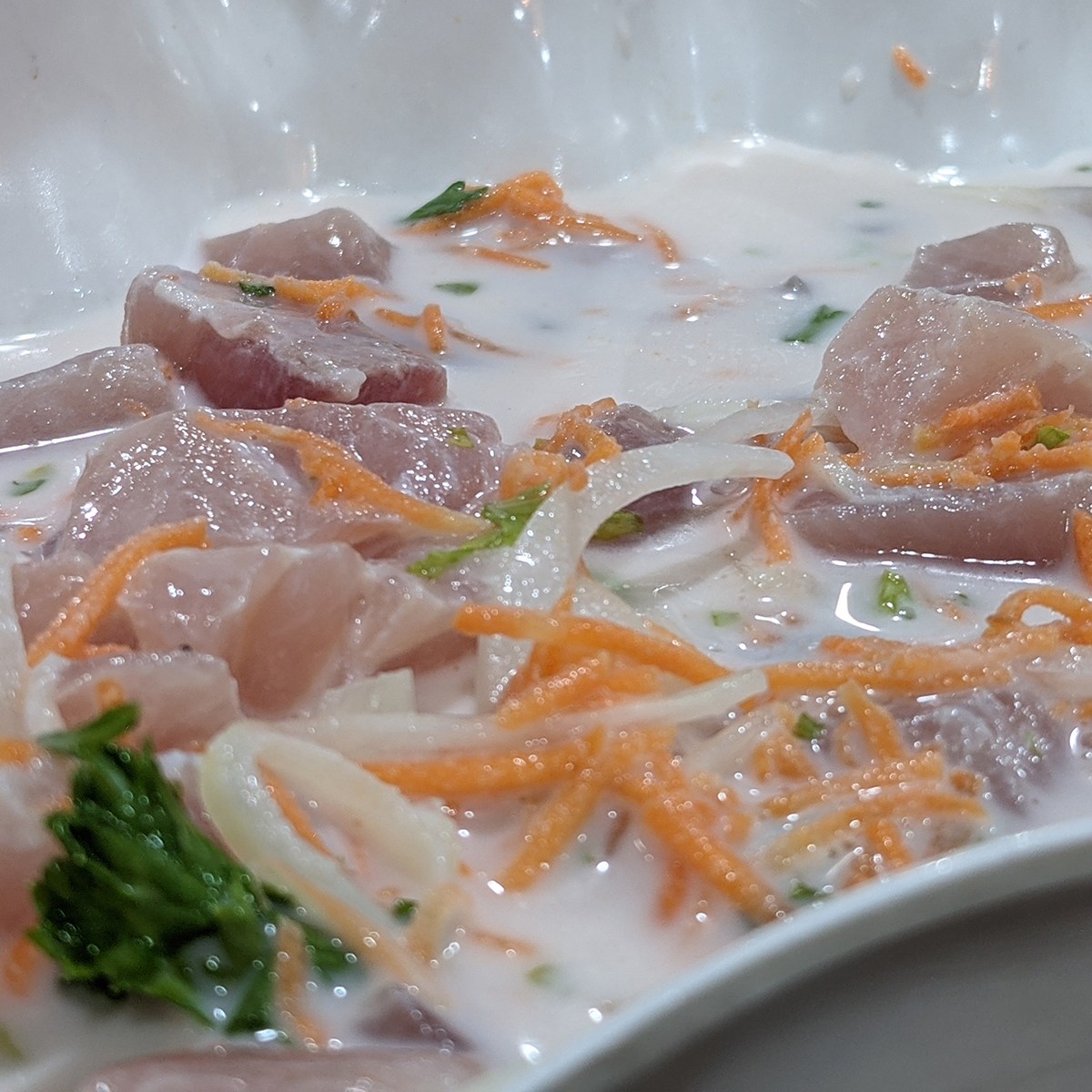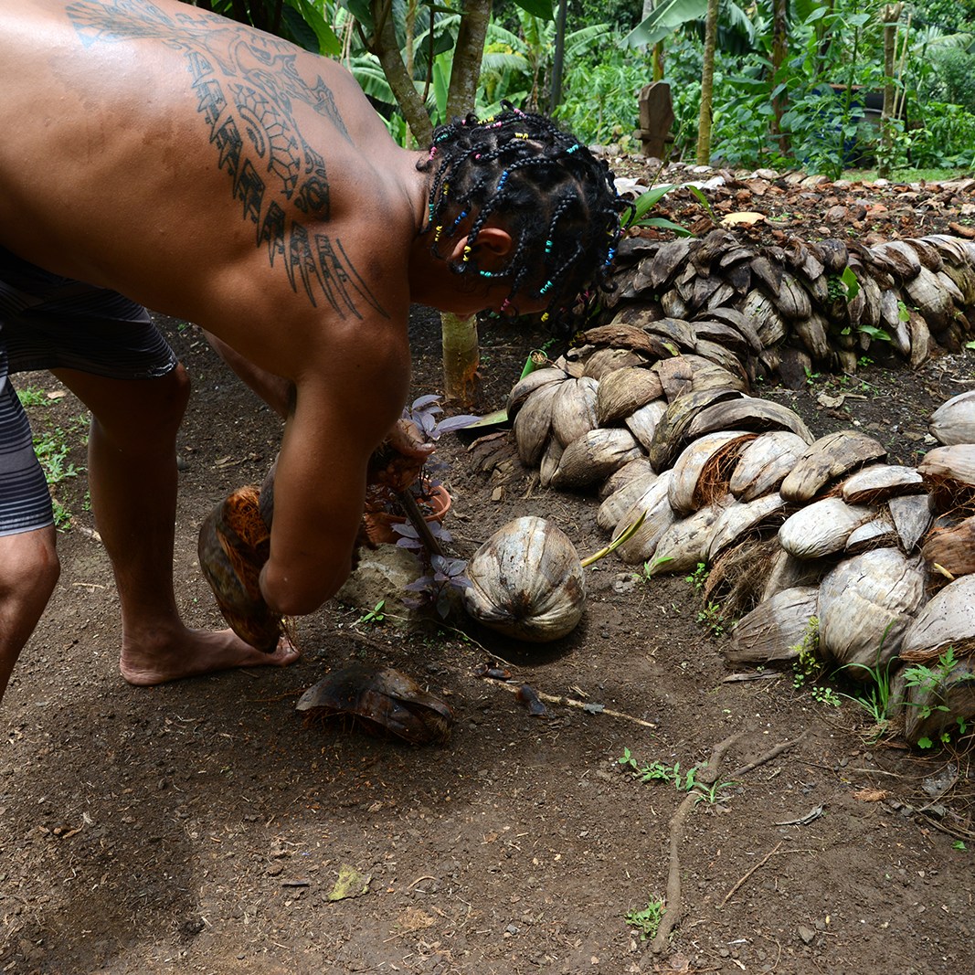 We dock the outrigger and cross the main road, where we meet Manu’s friend, Ati, who accompanies us up the side road I’d driven the evening before, to Sam’s house. Ati had been the long-tenured head baker and confectioner at the Mo’orea Intercontinental before it closed due to the Coronavirus and everyone except a skeleton security crew was laid off with only a few weeks’ severance pay, a sorrowful story played out in tens of thousands of variations in these islands. Today, Sam has enlisted Ati to oversee the stove, which involves, among other duties, char-roasting the uru (which the locals know as “bread fruit,” for its center that is the love child of a frisky Yukon Gold and a voluptuous gros pain), baking the taura (an indigenous root similar to taro, but richer in flavor) and frying the fish. Meanwhile, Manu and I — mostly Manu — harvest, husk and shred the coconuts while Sam prepares his own take on poisson cru au lait de coco, a regional specialty of raw fish (usually tuna or marlin — today it’s marlin, which Sam prefers over tuna) in fresh coconut milk enlivened by lime, onion, cilantro and other spices.