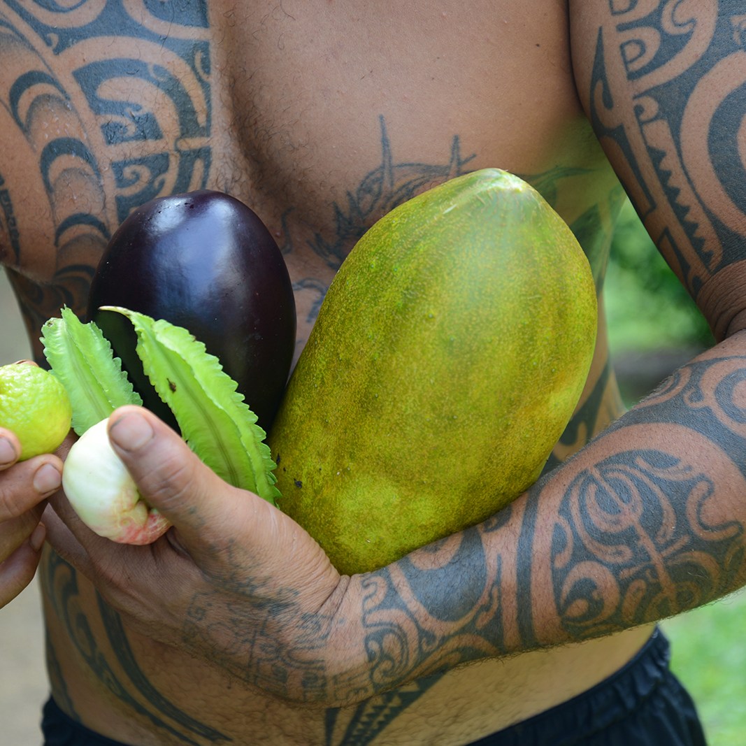 Sam proves to be more loquacious and considerably more affable — even when doing an unnervingly convincing haka at me while he squeezes coconut milk through a cheesecloth — than I’d supposed at our first encounter the evening before, and he explains many things to me over the course of our relaxed, multi-hour meal. For instance, he explains that his two dragon tattoos (one on the left side of his abdomen and the other, more abstract and angular one on his back) are in homage both to his Chinese birth year and to his ancestors. These, he says, hailed from what is today Taiwan and populated the islands in progressive ebb-and-flow waves, by cultivating and planting newfound islands, retreating for several years to previously established homelands, returning to harvest and colonize, and then proceeding in similar fashion to more distant islands.