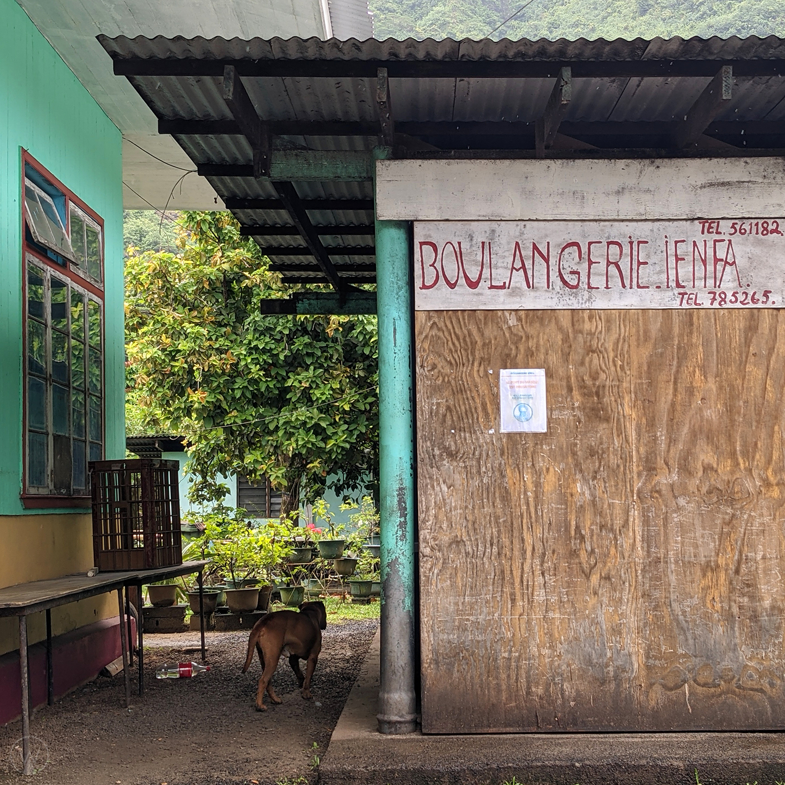And so the next morning, after submitting my self-administered COVID-19 test to the rural hospital on the opposite side of the island (a mid-visit checkup required of all guests in French Polynesia, and my third test in a week), and then waiting a bit longer to recover my sight after having poked my own brain with an eight-inch nasal swab — an indescribable delight — I meet Sam near the Eglise de la Sainte Famille. Sam apologizes that his daughter’s school activity makes it impossible for him to take me fishing, but that his young friend and apprentice, Manu, will do the honors expertly, after which we’d all meet Chez Sam for lunch.