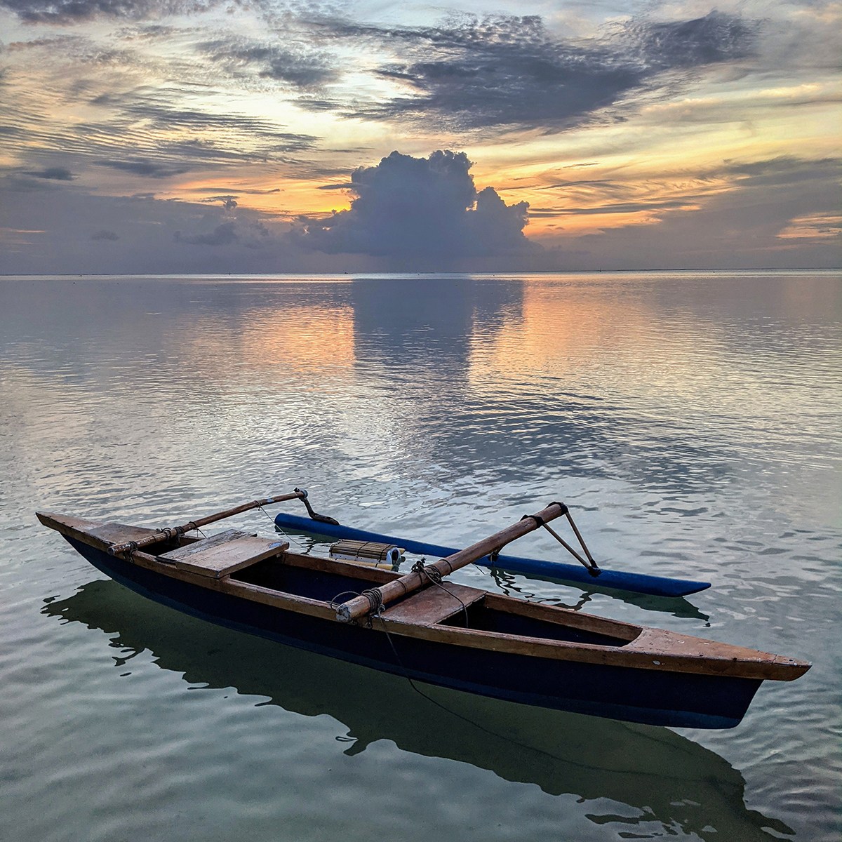 Manu, meanwhile, has been swimming directly toward the center of the circle, and then veers off toward the end where I had been. Here he signals me to come back over, and begins to carefully roll up the net with a rainbow of fish now caught in its web. He hoists this up into the outrigger and we climb back aboard.