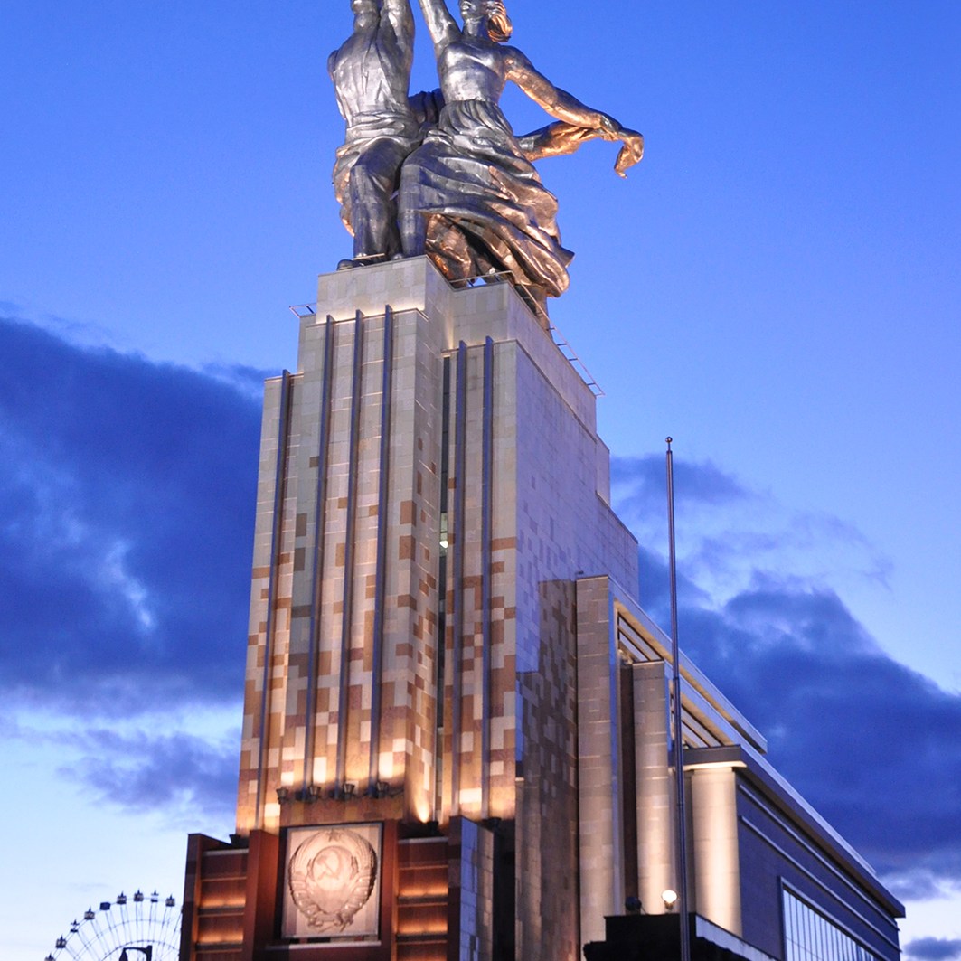 The cause of these musings was the magnificent Worker and Kolkhoz Woman monument (kolkhoz means “collective farm”), designed by the prominent Latvian artist and “Queen of Soviet Realistic Sculpture,” Vera Mukhina, for the 1937 World’s Fair in Paris. There, at the base of the Eiffel Tower, the 25-meter marvel in steel and stone faced off against the swastika-topped German exhibition directly across the Trocadero esplanade, the implications of the unsubtly eastward thrust of hammer and cycle held by the colossal couple not lost on the Fair’s attendees.