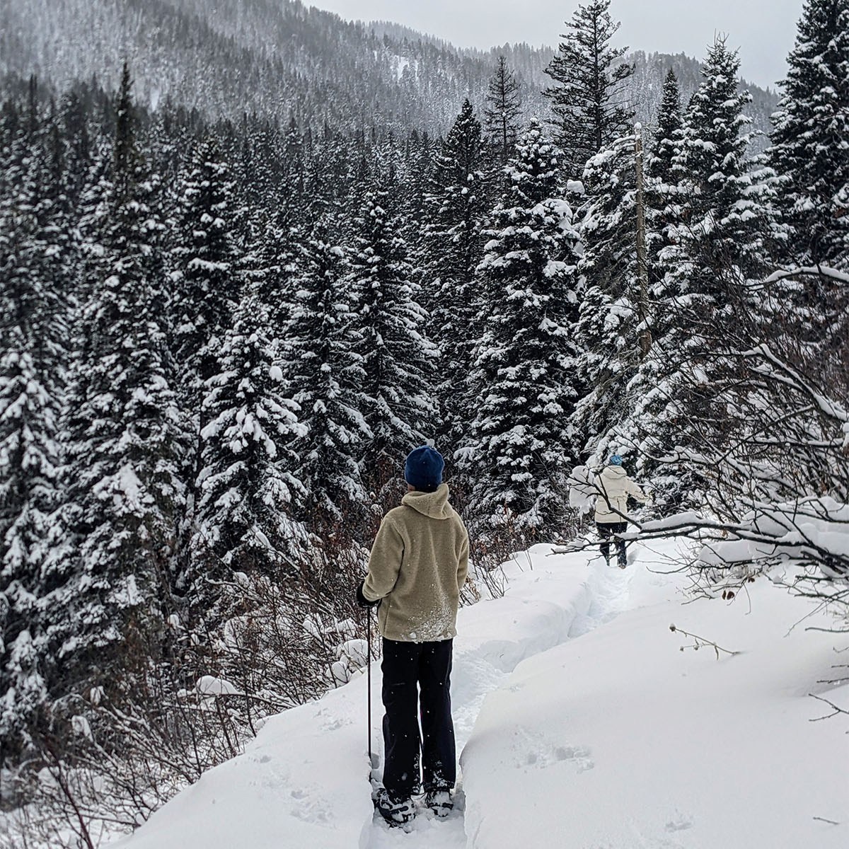 - Snowshoeing. A four-mile drive in almost any direction from downtown Jackson will land you on supreme snowshoeing terrain. The trail to Taggart Lake is perfect for an afternoon, but also fairly popular and so it gets packed-in pretty quickly after a storm. Following Trail Creek as it weaves among the pines toward the valley will give you an immediate sense of secluded wilderness, even if you’re just a few dozen yards downhill from popular Old Pass Road. If you want to guarantee yourself fresh tracks, explore the foothills along Wilson’s South Fall Creek Road, which runs parallel to Fish Creek and the Snake River. Bring bear spray. Which reminds me of the joke about the tourists who asked the ranger how to know what kinds of bears were around. “Check the scat. A black bear’s will have twigs and fish bones. A grizzly’s will have Gore-Tex and bear spray cans.”