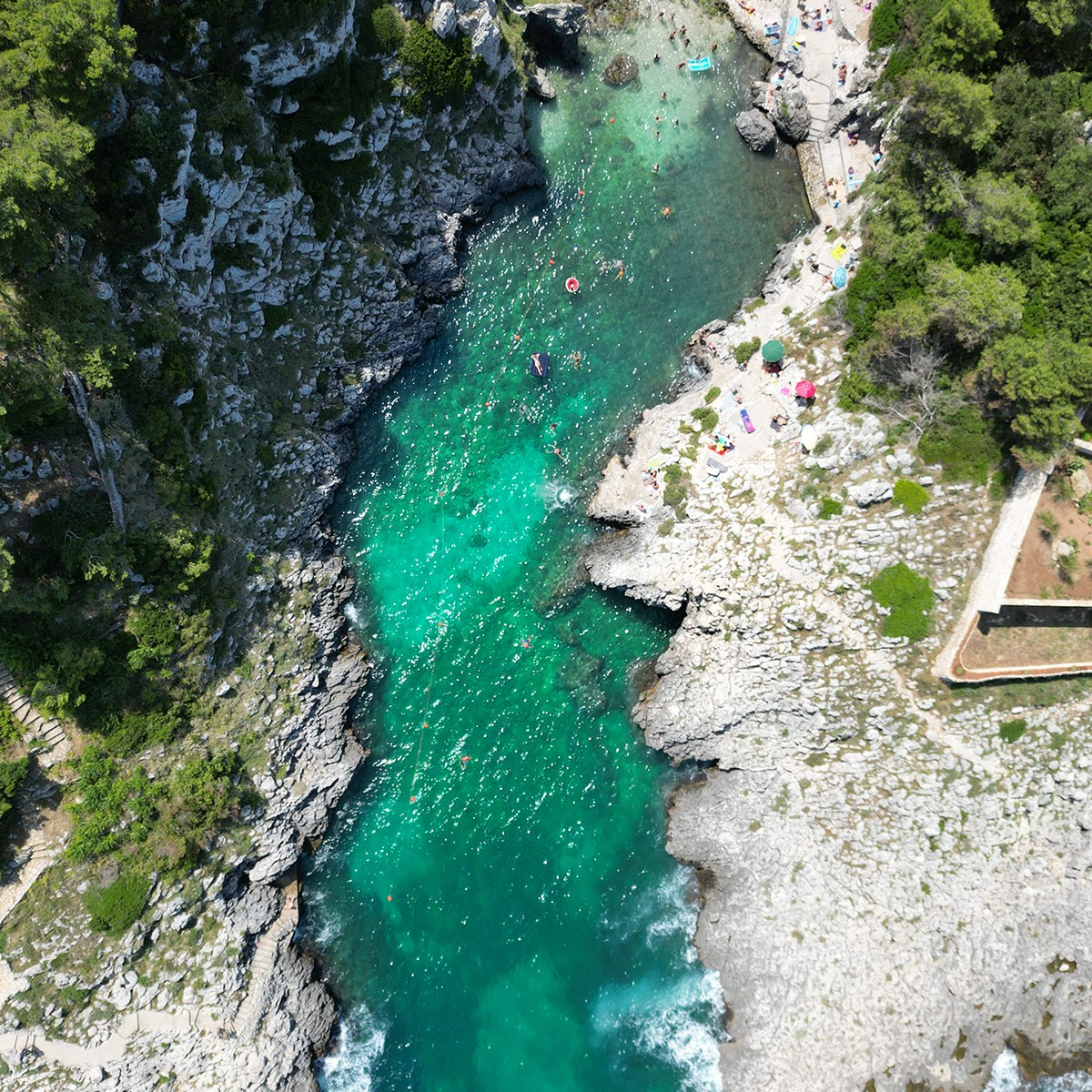 Ten minutes north of Otranto are two beaches, Baia dei Turchi (Bay of the Turks) and Spiagia Alimini, that you probably won’t regret skipping as you continue to Torre dell’Orso. While its modern town center fails to thrill, the long, crescent beach hugged by a pine forest excels as one of Puglia’s best for families seeking soft sand, crystalline water, and a full complement of amenities. If you’re here at sunset, don’t miss the view of the Due Sorelle (Two Sisters) from the panorama point at the southeasternmost end of the beach. Opposite to the north, the Grotta della Poesia (Cave of Poetry) achieved Insta-celebrity as an especially photogenic swimming hole, with recent archaeological discoveries having led to limits on access.