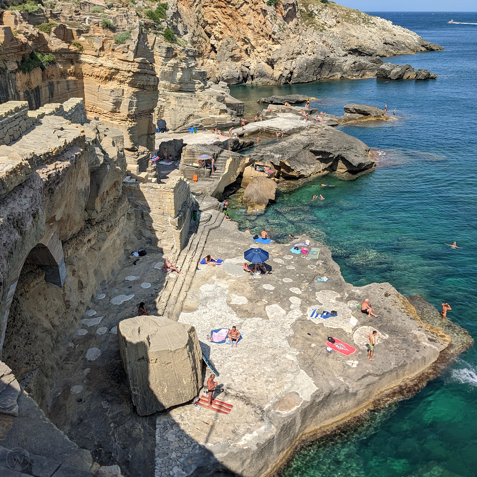 Hugging the Salento coastline northward from the Heel, my first stop was Cala dell’Acquaviva (Cove of Living Waters), a spring-fed bay the size of a narrow soccer pitch, whose crystalline water has been a favorite swimming hole dating back to Roman times. (I was going to specify a “locals-only” swimming hole, but you’ll find that nearly everything for the next 500 kilometers could be described as locals-only. In fact, it wasn’t until reaching Venice that my tally of people speaking something other than Italian finally surpassed three dozen – and, yes, I did count them.) Two seaside stops followed a short distance later: Porto Miggiano, a sandy strip that has no facilities but does feature the remains of a handsome 16th-Century tower, and Bagno Marino Archi, which, instead of a beach, features several flat, massive stone formations well-suited to sunbathing and diving, extending into the sea from the base of a cliff in which the ruins of an ancient arch are still visible.