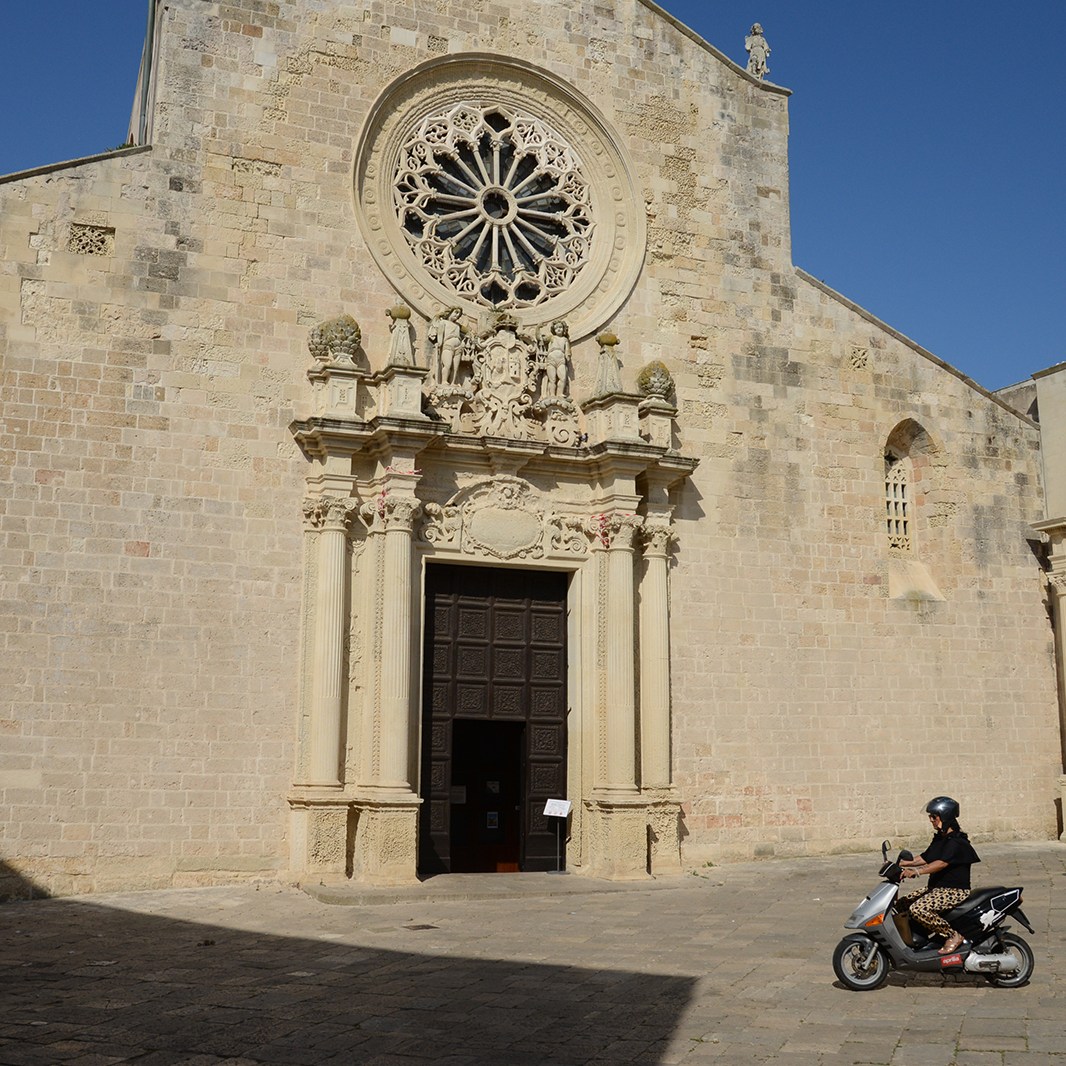 The next half hour of driving up SP358 captured much of the varied delight of this region. Santa Cesarea Terme is Exhibit A for resort town municipal planning done well, with rows of stately homes (Neo-Florentine, modern, and even something that looked Eclectic-Ottoman) followed by an arcaded galleria with shops at street level and trattorias and hotels above, all of it fronting a promenade reminiscent of that of Lugano. As this scene faded in the rearview mirror, I found myself almost starring in a Fiat commercial as I wound through the vast Parco Naturale Regionale Costa Otranto (Otranto Coast Regional Nature Park). Grassy hills straight from a 17th-century canvas tumbled down to the coast, with numerous, dusty side-roads leading to hidden bays and mysterious sea caves, where ancient watchtowers and a lighthouse or two overlook secluded beaches. The serenity of this stretch served as a fitting contrast to the energy of my next stop.