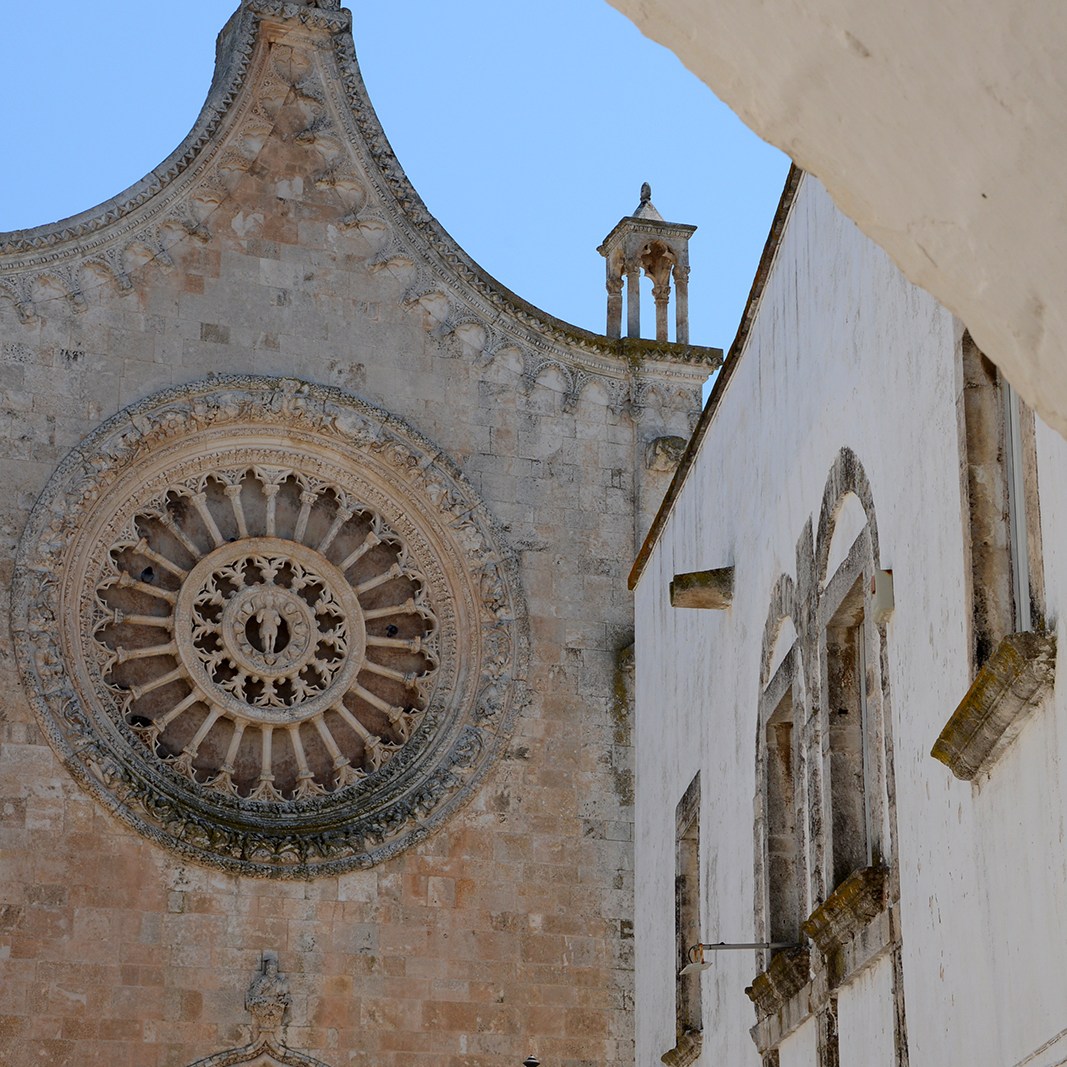 Its centro storico fully illuminated at night, Ostuni seemed to float in the distance on my approach. I lodged at Maison de Ostuni, an unforgettably charming B&B tucked into a vicolo (alley) just off of Corso Giuseppi Mazzini two blocks from Chiesa San Francesco d’Assisi. From the triangular Piazza della Libertà, whose polished travertine glistens in the sun, Via Cattedrale ascends in a fairly direct route to the Duomo Santa Maria Assunta, but be sure to get lost on the way up and/or down. While these and other towns throughout the region share common characteristics (whitewashed, hilly, mazes of streets, adorable, etc.) with other Mediterranean villages, such as the Pueblos Blancos of Andalucía, of the towns in this group, Ostuni seemed most to resemble counterparts on the Greek Cyclades thanks to flecks of brilliant blues, greens and pinks everywhere, not just in the ubiquitous wisteria and bougainvillea but in architectural details that seemed to have resulted from a deliberate decision, “Our neighborhood’s going to be primarily gray and white, but not exclusively.”