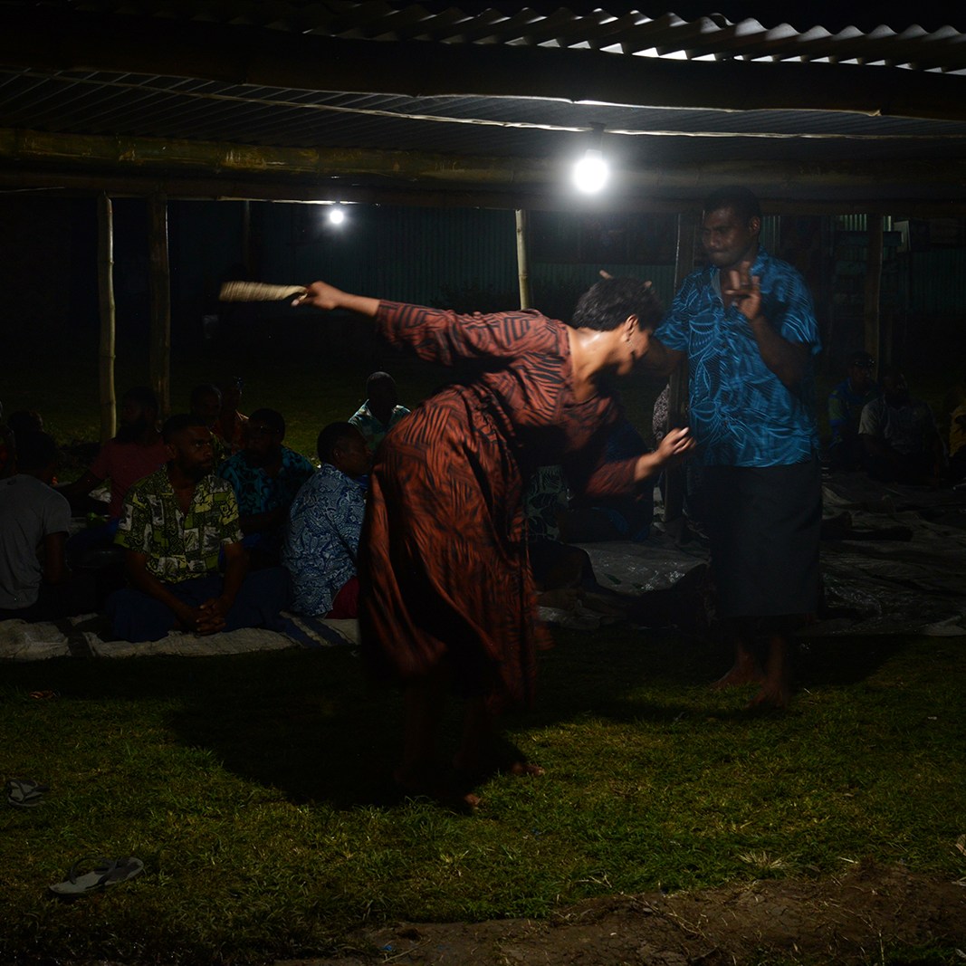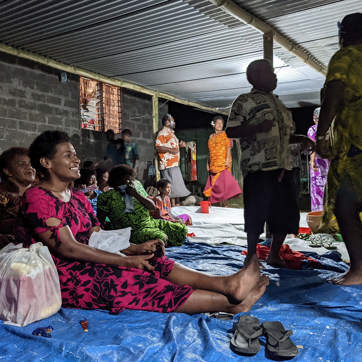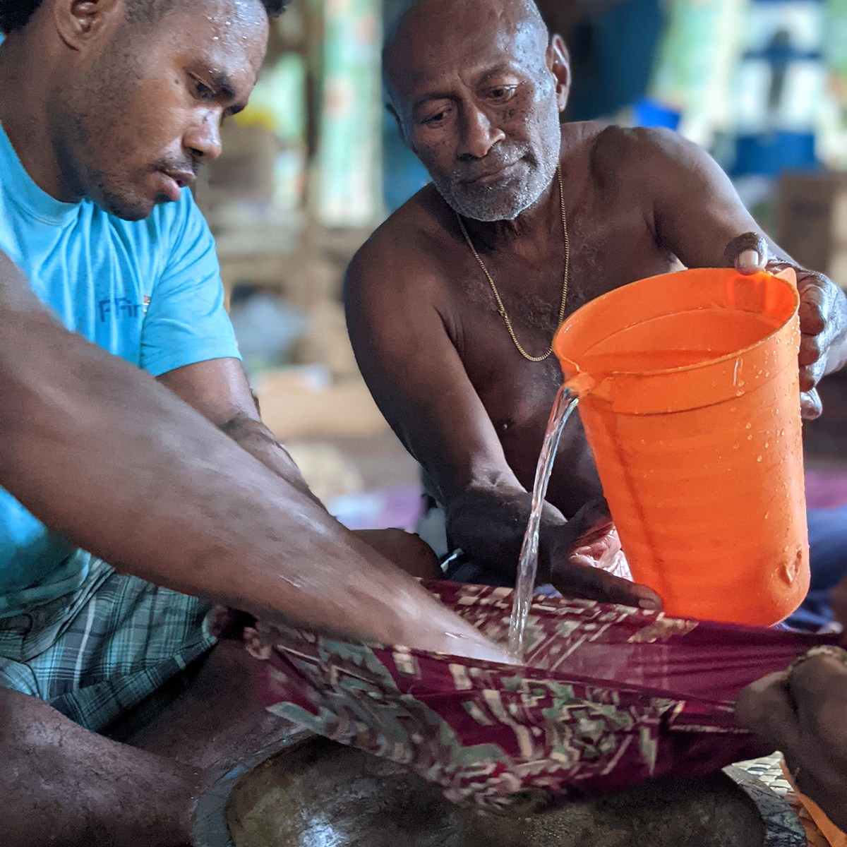 A woman in her sixties stirred from a pile of pillows in the room’s far corner, sat up and introduced herself and her family members in English. She was Mere, aunt of the young man I now knew as Noah, and the gentleman was Isaac, her husband. She was a retired nurse who had been reactivated during the pandemic to provide vaccinations at small, ad hoc stations established throughout the country’s remote villages, news that assuaged my concerns about my plague-bearing droplets. While Mere told me of how the island had endured the pandemic, Noah left and returned moments later with his cousin Tom, Mere and Isaac’s son, who had also been in the truck. They carried a pitcher of water, a tanoa (a carved wooden bowl the size of a large salad bowl), two halves of a coconut shell, an ornate burgundy cloth, and what appeared to be a heavy-duty wheelbarrow tire painted red.