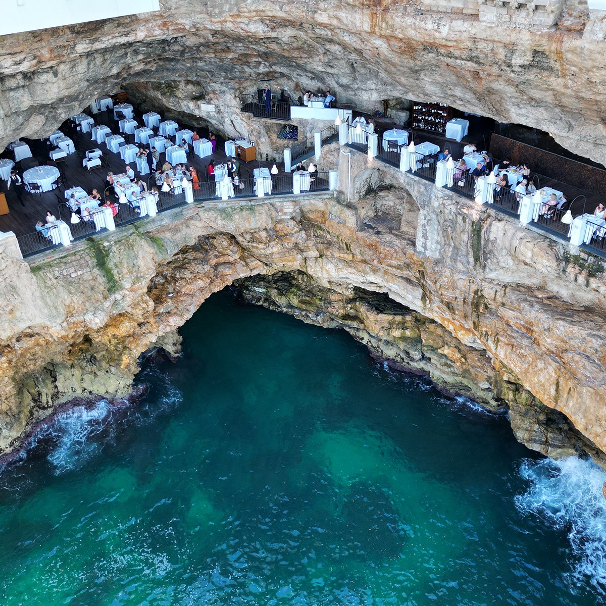 Perhaps the most famous attraction of Polignano a Mare, just ten kilometers up the coast, is the Grotta Palazzese restaurant, whose draw is not its grossly overpriced (especially by Puglian standards) and gastronomically underwhelming (again, especially by Puglian standards) menu, but instead its spectacular location in a cliffside grotto that opens over a small cove and, if the Earth weren’t round, would give diners views straight over the Adriatic to Albania. The restaurant is located at one of the many dead-ends that reveal Polignano’s ocean views and which are most easily accessed by entering the centro storico through the Arco Marchesale gateway, then wandering aimlessly through its maze of narrow streets until the sea appears, which it invariably will, appreciating along the way the balconies and plazas, such as Piazza Vittorio Emannuele II, on which stands Palazzo dell’ Orologio (Palace of the Clock) and the 19th-century clock that replaced its original sundial.
