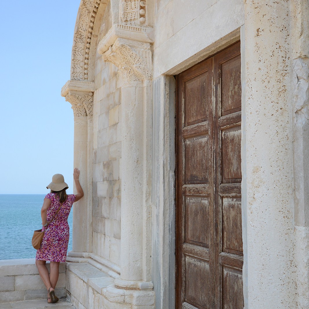 The primary draw of our next stop, Trani, was its Beata Vergine Maria Assunta cathedral, whose plot juts dominantly into the azure Adriatic, a position that accentuates its elegant starkness. A recent cleaning – the workers were dismantling the scaffolding during our visit – caused the creamy, Romanesque exterior to glimmer such a bright near-white under the Mediterranean summer sun that we had to squint when looking at it, and further emphasized the rich green of its impressive, copper-clad doors. A stone’s throw up the shoreline, the Castello Svevo (Swabian Castle) has a similarly commanding presence and, fashioned from the same stone as the cathedral, serves as a complementary symbol of medieval power.