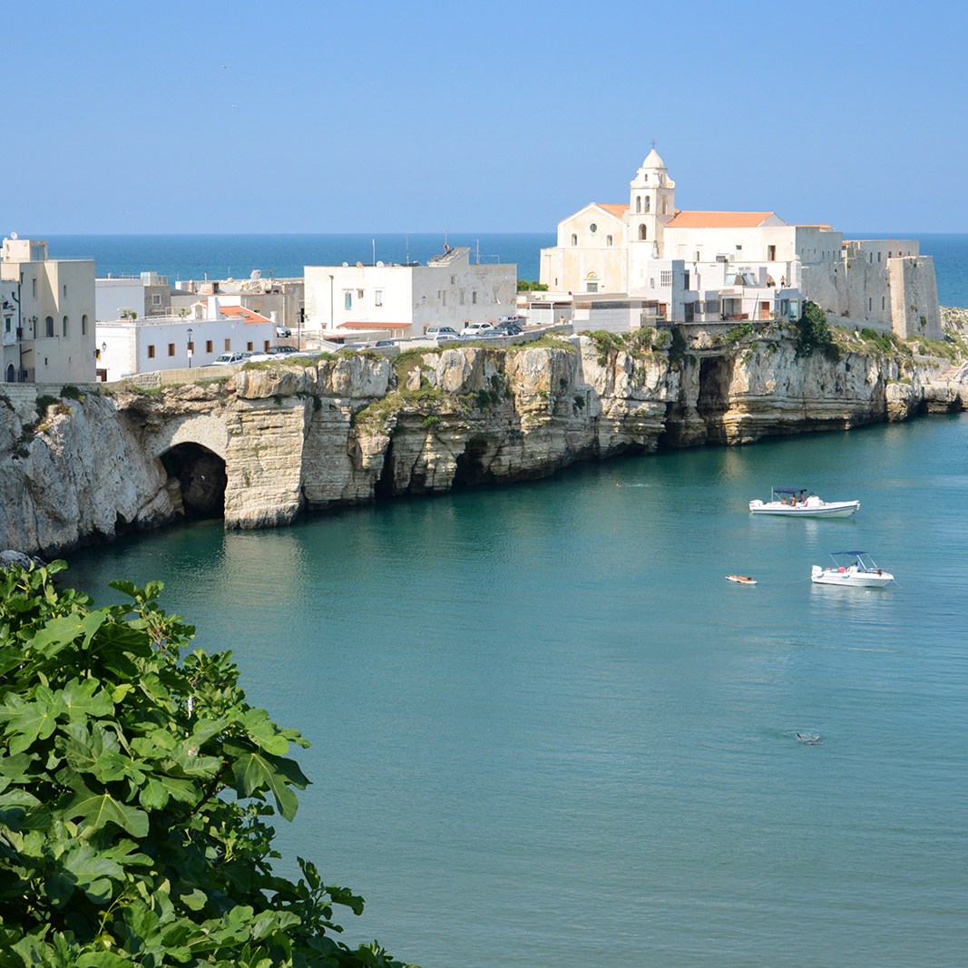 Vieste, at the Peninsula’s eastern tip, was as-advertised: a rugged old castle, Castello Svevo Aragonese, overlooking one of the region’s longest beaches, whose north end is punctuated by Monolite Pizzomunno, a 25-meter limestone monolith; Santa Maria Assunta, a baroque cathedral stacked atop Romanesque bones, with her little brother, San Francesco, all ready for his close-up at the end of the peninsula below the centro storico; a perfect stop for vinegars, pastas and other regional treats such as delectable pesto di zucchine, Gustose Tradizioni, at Via Duomo 7. All of it bundled into a warren of cobblestone walkways, every last one of which eventually ends at the sea itself or a postcard-perfect view of it.