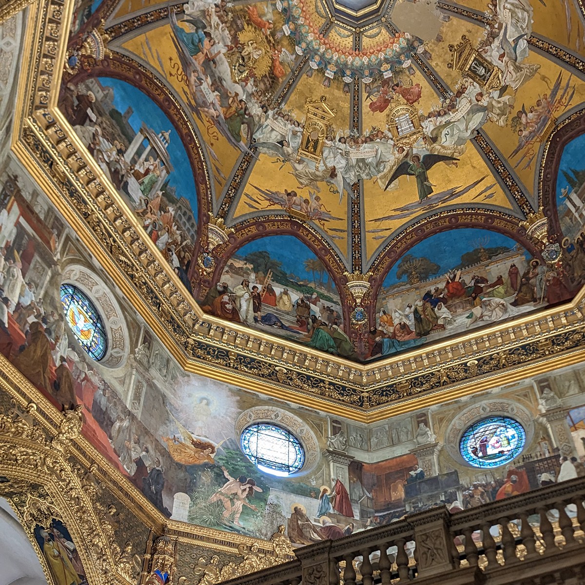 Passing dozens of nuns giddily snapping selfies at the fountain – designed, appropriately, by Giovanni Fontana, or John Fountain – we ascended worn marble steps smoothed by the weary feet of legions of faithful and stepped inside. Thanks to extensive renovations around the turn of the 20th century, the Baroque façade yielded to an eruption of Art Nouveau color and craft for which we were wholly unprepared, this marriage of the two contrasting styles symbolizing perhaps the desire of the faithful to renew sacred vows while preserving foundational traditions. Everything here is grand at first glance: the soaring nave, the frescoed ceilings, the altars heavy with ornament, but these attractions are not the miraculous magnet. For that, we followed the queue into a smaller, hushed space within, a small house encased in layers of marble sculpture, like a reliquary protecting bone and blood.
