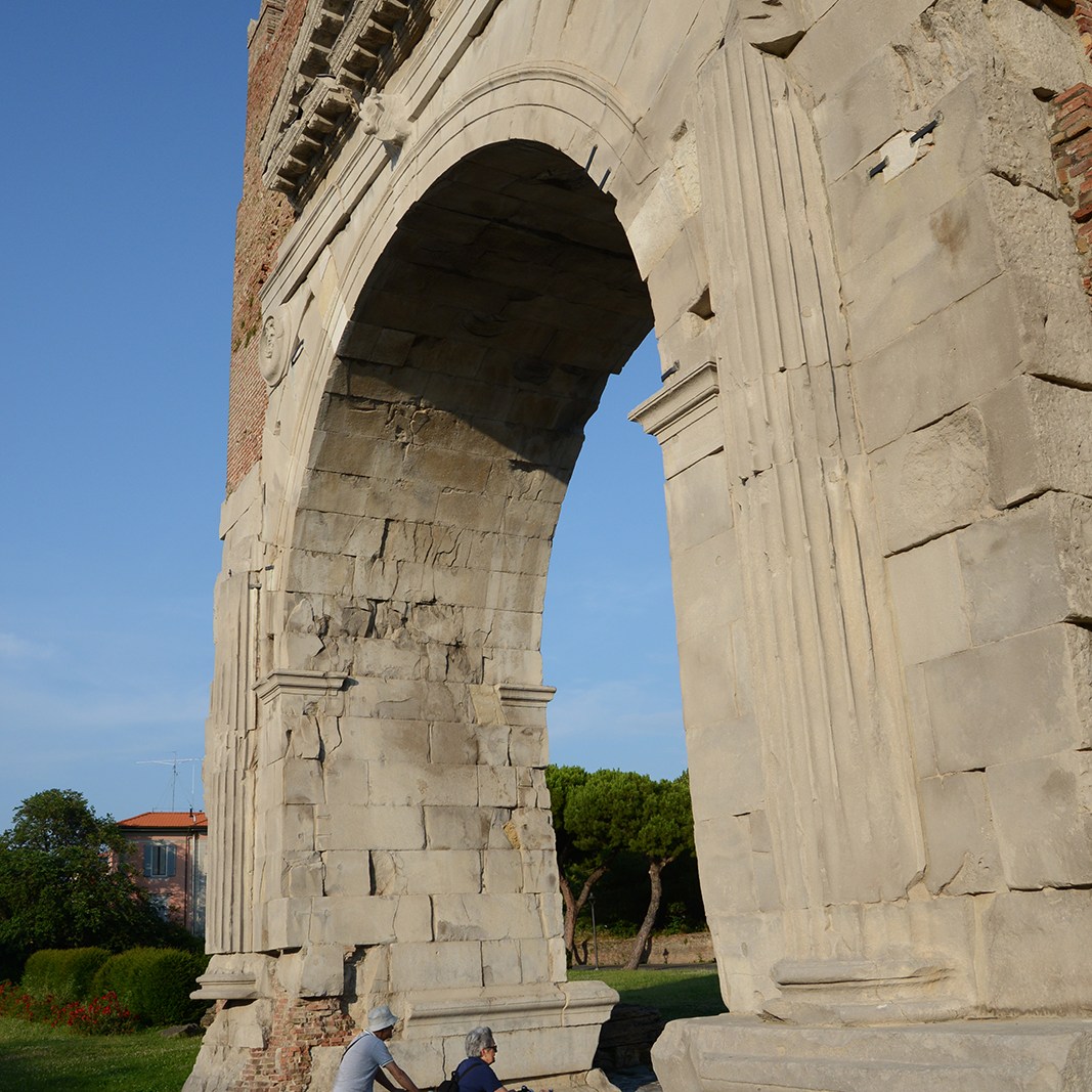Few, outside of fans of Dante and/or Tchaikovsky (for the latter’s Francesca da Rimini based on the former’s tale of her in his Divine Comedy) or of Mediterranean spring breaks, will recognize the name “Rimini.” The city’s reputation, at least among northern Europeans, is as a stretch of coastline devoted to sunning and carousing, a place of umbrellas lined like dominoes along kilometers of eurotrunk-dotted sand. (Even a friend from Lombardy initially scoffed at my idea of including Rimini in this itinerary, eventually conceding that perhaps the historical center merited a stroll.) But its ancient elements have real gravitas, gravitas that most visitors stride past in flip-flops en route to the lido. That evening, the heat had ebbed when we parked our car and – as authorized by my skeptical amico lombardo – entered the centro storico.