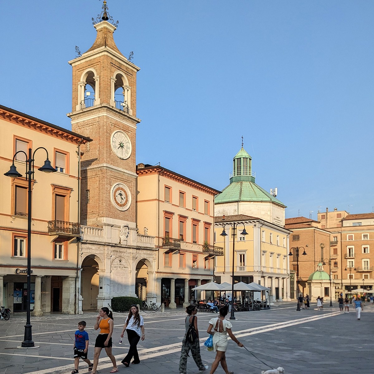 As techno music beats on the nearby beach, Rimini’s heart beats in its piazzas. Piazza Tre Martiri stretches wide, a crossroads since Roman times, whose name (it was formerly Piazza Giulio Cesare, to commemorate the speech he gave here in the forum after crossing the Rubicon) and a plaque honor the three young resistance fighters whom the Nazis hanged here, while a second monument thanks the Allied troops who liberated the city in 1944. Just up the street, Piazza Cavour glows with civic pride, flanked by two 13th-century palazzi, dell’Arengo and del Podestà, their gothic outlines framing the square like frozen shadows. Cafés scatter their tables across the cobblestones, and the square feels alive in a distinctly Rimini way: fashionable and important, yet unassuming.