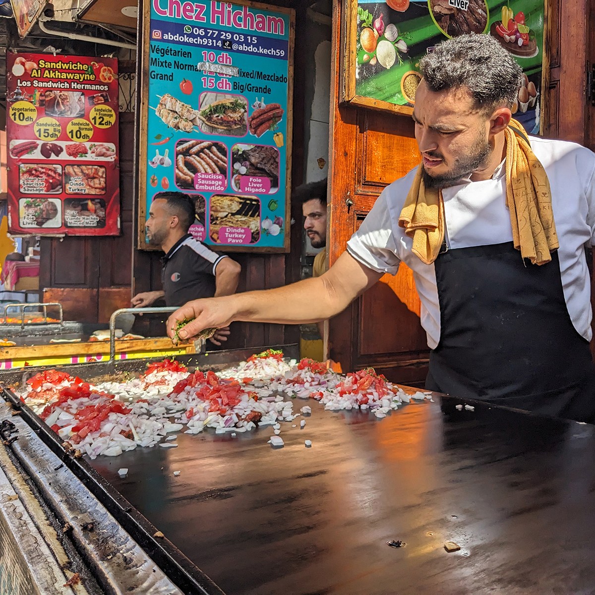 To venture deeply into the medina’s buzzing souks (areas dedicated to specific artisanal trades within a larger traditional Moroccan marketplace, which functions as a whirling hub for commerce and social interaction) is to will upon oneself indelible impressions inscribed by complete sensory overload. Within the length of a few strides, we enjoyed mixte sandwiches (of sausage, chicken and liver grilled with onions, tomato and egg) followed by fresh fruit juice, watched a shoemaker dyeing leather soles and a blacksmith pounding incandescent iron, and speculated on the authenticity of some “Louis Vuitton” soccer balls.
