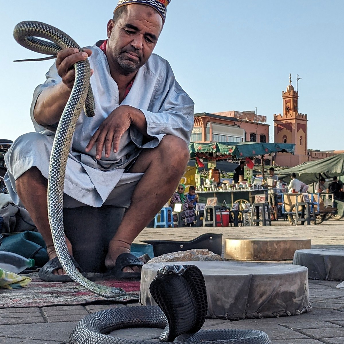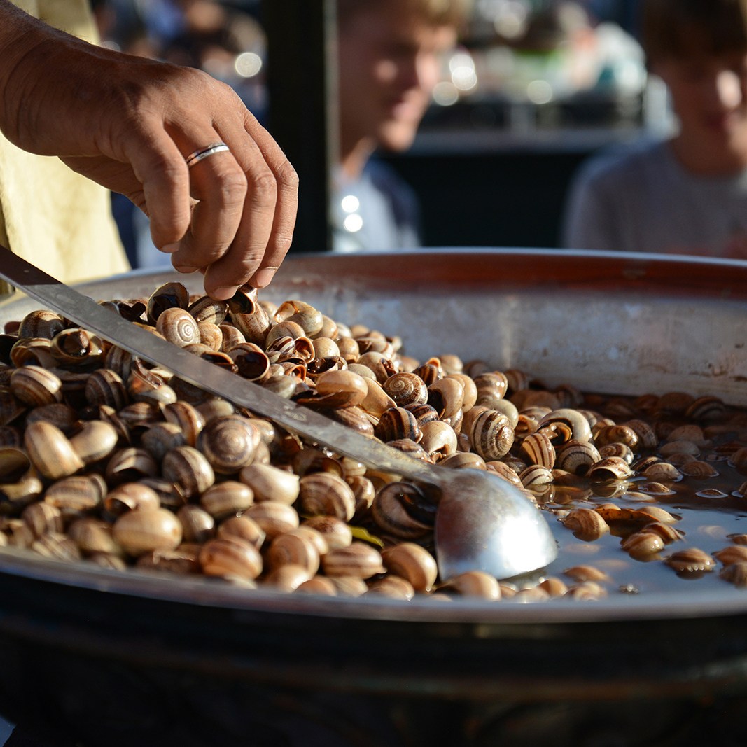 “Of course you will visit Jemaa El-Fnaa,” a Moroccan colleague had advised me. “You’ll find it’s fairly dead mid-day because of the heat, but the market really comes alive at night.” Anyone who’s visited Madrid’s Plaza Mayor, Times Square in New York City, Rynek Główny in Krakow or Rome’s Piazza Navona has an idea of what “really comes alive at night” entails, yet nothing had prepared me for the exuberant explosion of humanity that greeted us here in Marrakesh’s heart. I could discern no specific occasion that had packed this place, seeing instead only continuous, whirling pockets of shoulder-to-shoulder celebrations of — of life itself, amid rhythmic drumbeats, the snake charmers’ hypnotic gaze, and carts offering spiced snails (or babbouche) simmering in a fiery broth. “Don’t dine directly on the square,” further advice we’d heeded from my colleague, “but do try those snails.”