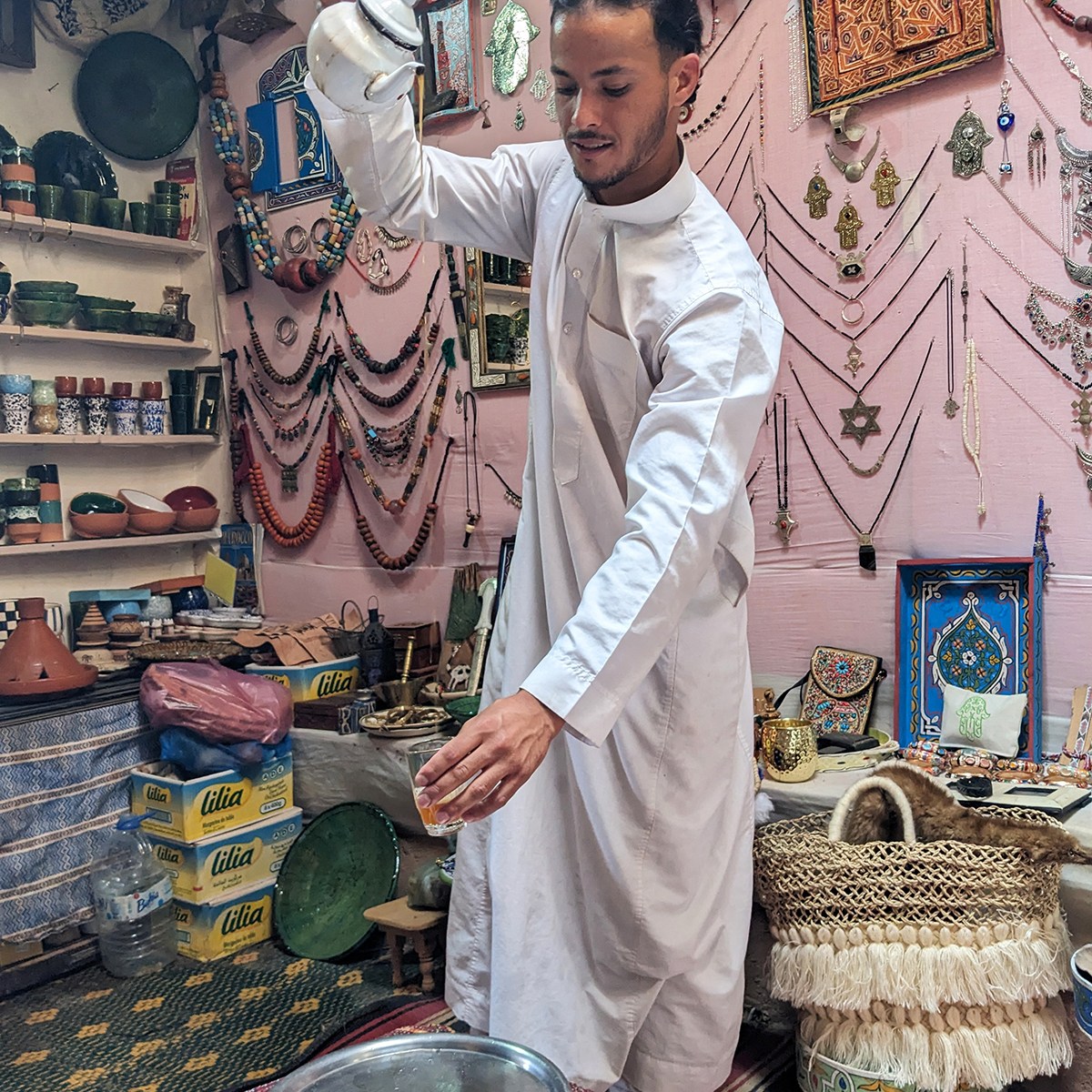 Beyond its heritage, Aït Ben Haddou has gained fame as a renowned film location for Lawrence of Arabia, Game of Thrones, Gladiator and others, but our enduring memory relies less on the silver screen than on silver itself. Working our way toward the agadir (a fortified granary on top of the hill), we accepted the invitation to step inside a shop, where Abdel, a third-generation smith of both silver and copper, showed us his handiwork and shared family tales threaded with resilience and faith. His U.S. student visa application had eluded for four consecutive years, but as he scrolled us through the U.S. Department of State e-mails on his phone, he repeated quietly, “God opens doors, bismillah,” giving my boys in twenty minutes a life-long lesson about heritage, craftsmanship, hope and tenacity. Nearby, Abdel’s neighbor Hassoun unlocked a narrow, dust-laden cave he wryly called “Aladdin’s Treasure Closet,” crammed with tribal masks, rusted rifles, and Jewish artifacts, echoing the ksar’s historical role in continental trade and conflict, in addition to serving as a Sephardic refuge during the Spanish Inquisition. I’m no antiquarian but have seen heaps of tourist-targeting knockoffs around the world, and this trove struck me as either authentics or superb fakes.