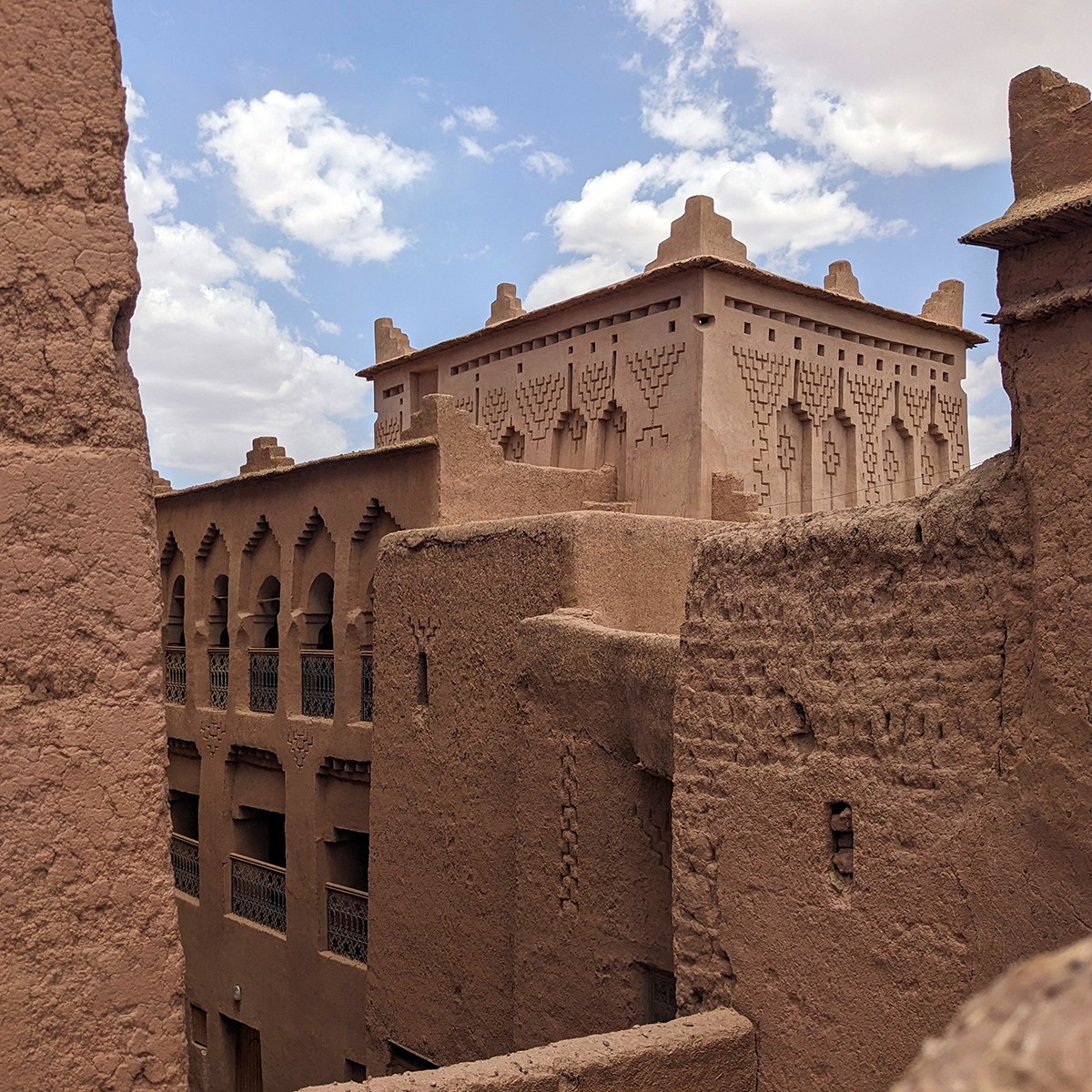 On the western outskirts of Ouarzazate sat Atlas Studios, embodying Morocco’s cinematic allure. One of Africa’s largest film studios, behind its towering gates were dusty props and set remnants from movies such as those named above as well as The Mummy, The Passion of the Christ, The Jewel of the Nile and even Asterix and Obelix: Mission Cleopatra. In the center of town was Kasbah Taourirt, the ancestral residence of the powerful Glaoui family, who controlled trade routes between Marrakech, the Ounila Valley and the Sahara. The intricate design of and within its walls whispered of both defense and dynasty, with about 300 rooms connected by narrow passageways, elaborate plasterwork, painted stucco and mosaics.
