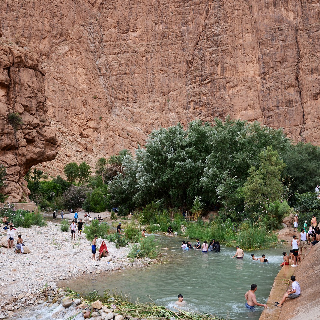 Another short detour brought us to Todra Gorge, where massive 300-meter cliffs soared above a sparkling swimming hole. We watched women take tea in delicate lace hijabs, witnessed a wedding celebration punctuated by thundering tam tams, and felt the vitality of a community deeply connected to its mountains and its river. Over millennia, the Todra River carved its Gorge with powerful volumes of water. Today, its often shallow stream nurtures oases and cradles life of flora and fauna alike, yet, as a recent National Geographic study emphasized, even the ingenious irrigation techniques employed across generations in this arid land are struggling to adapt to the increasing scarcity of both surface and groundwater.